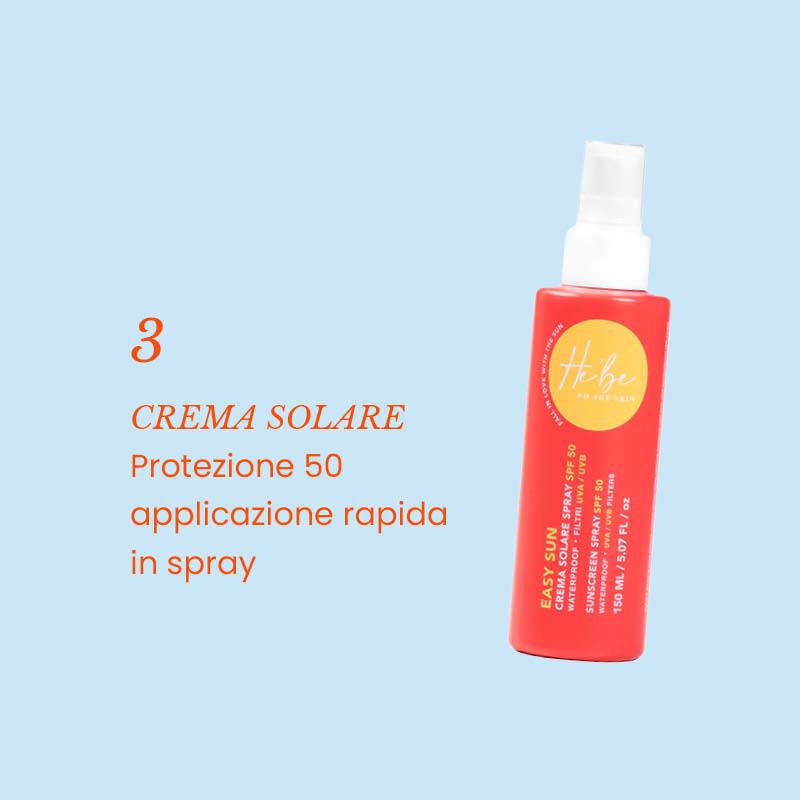 Prosegui poi la tua giornata estiva o di vacanza dosando su tutto il corpo EASY SUN, la crema solare con protezione 50 con comodo applicatore spray , ricordandoti di applicarla almeno ogni due ore se fai il bagno.