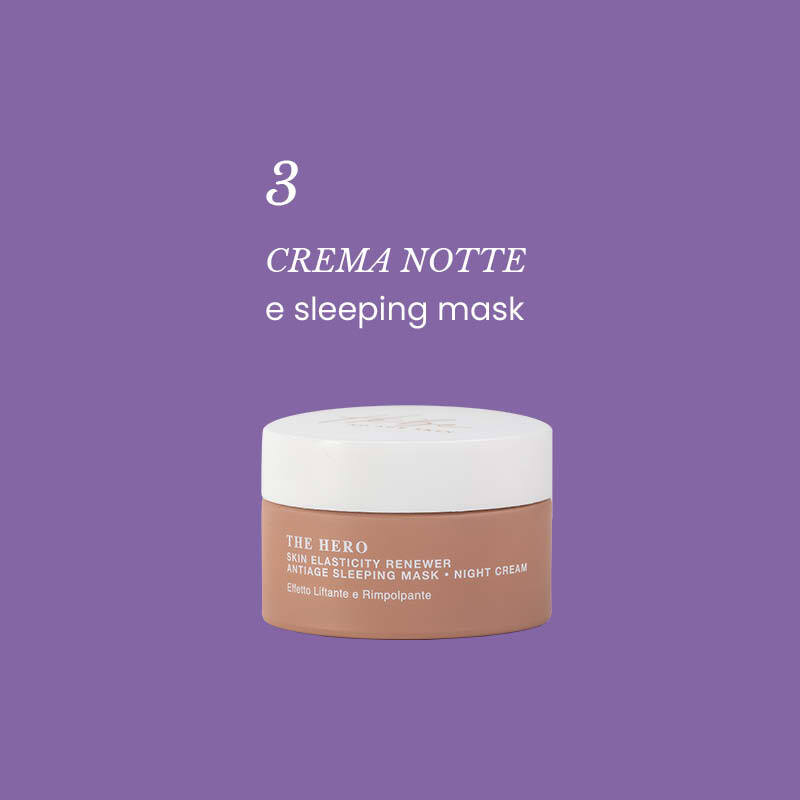 THE HERO (50 ml / 1.69 FL. OZ.): una crema notte – anche sleeping mask – dal potere rigenerante, grazie all’azione combinata di acido ialuronico, burro di karitè e microsfere di collagene marino che contribuiscono ad attenuare le rughe rendendo la pelle idratata, rassodata e luminosa.